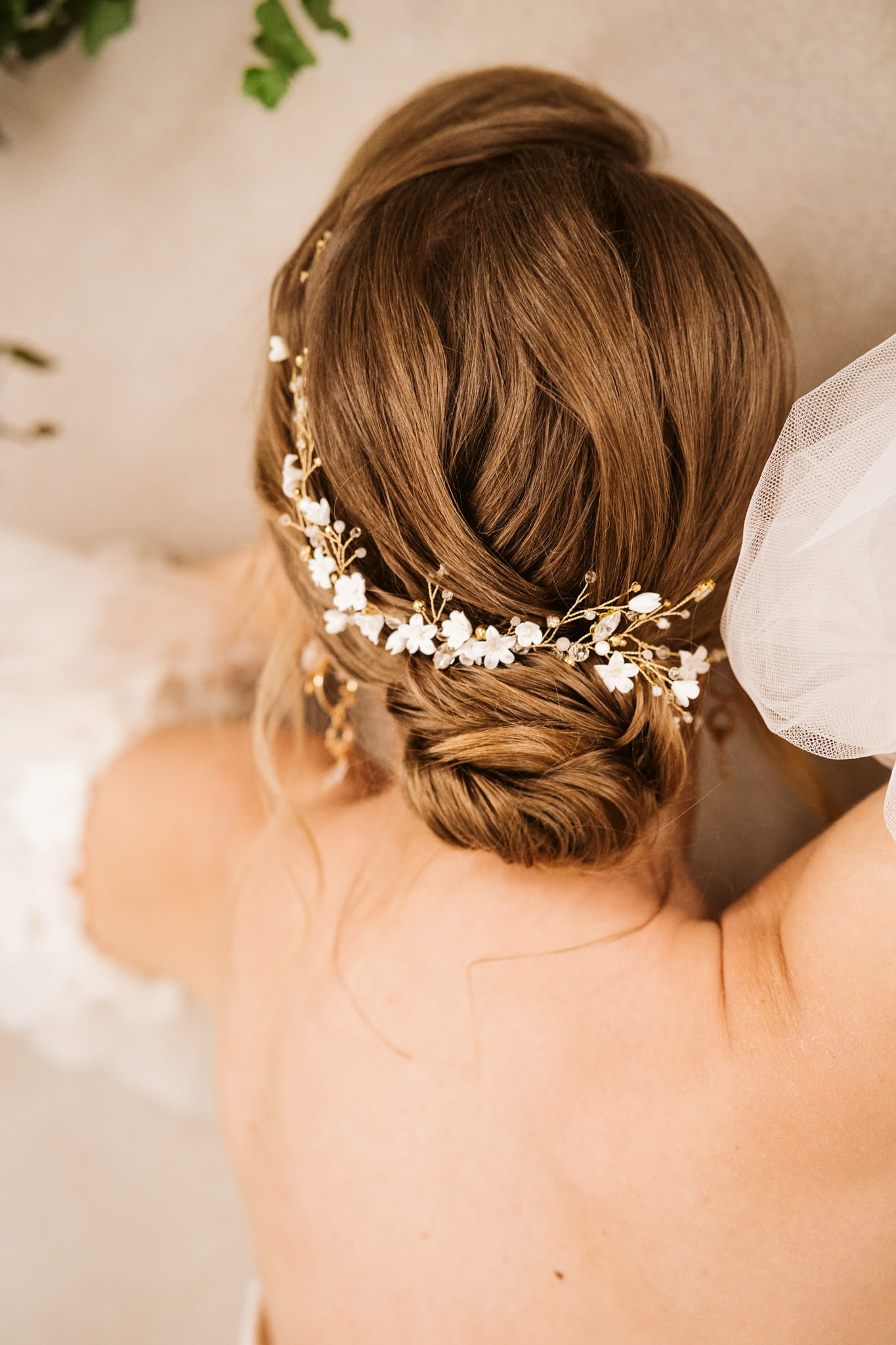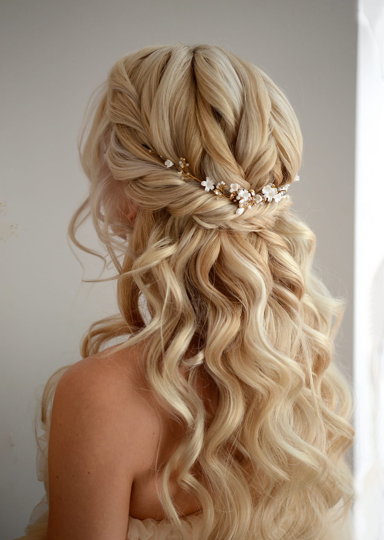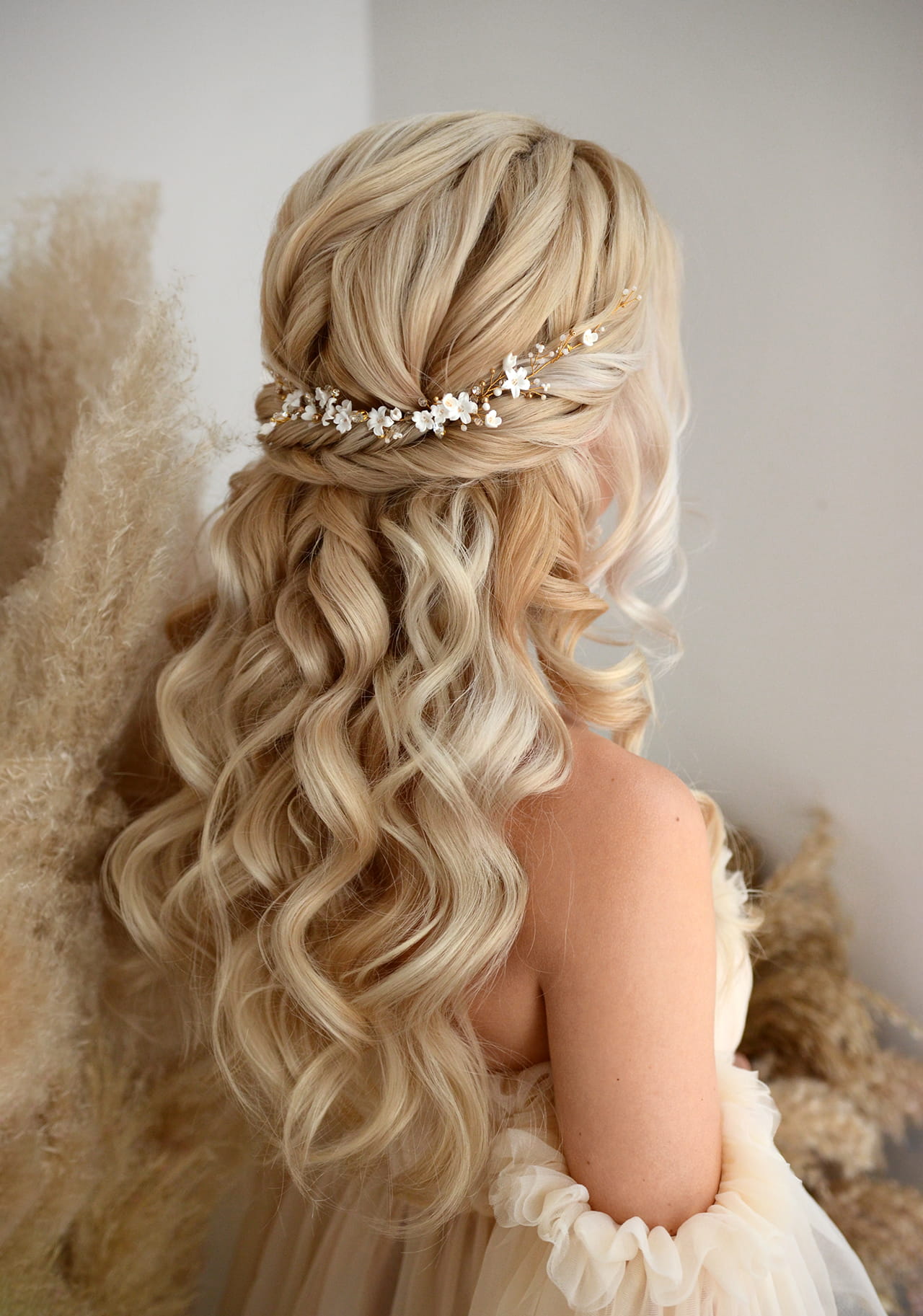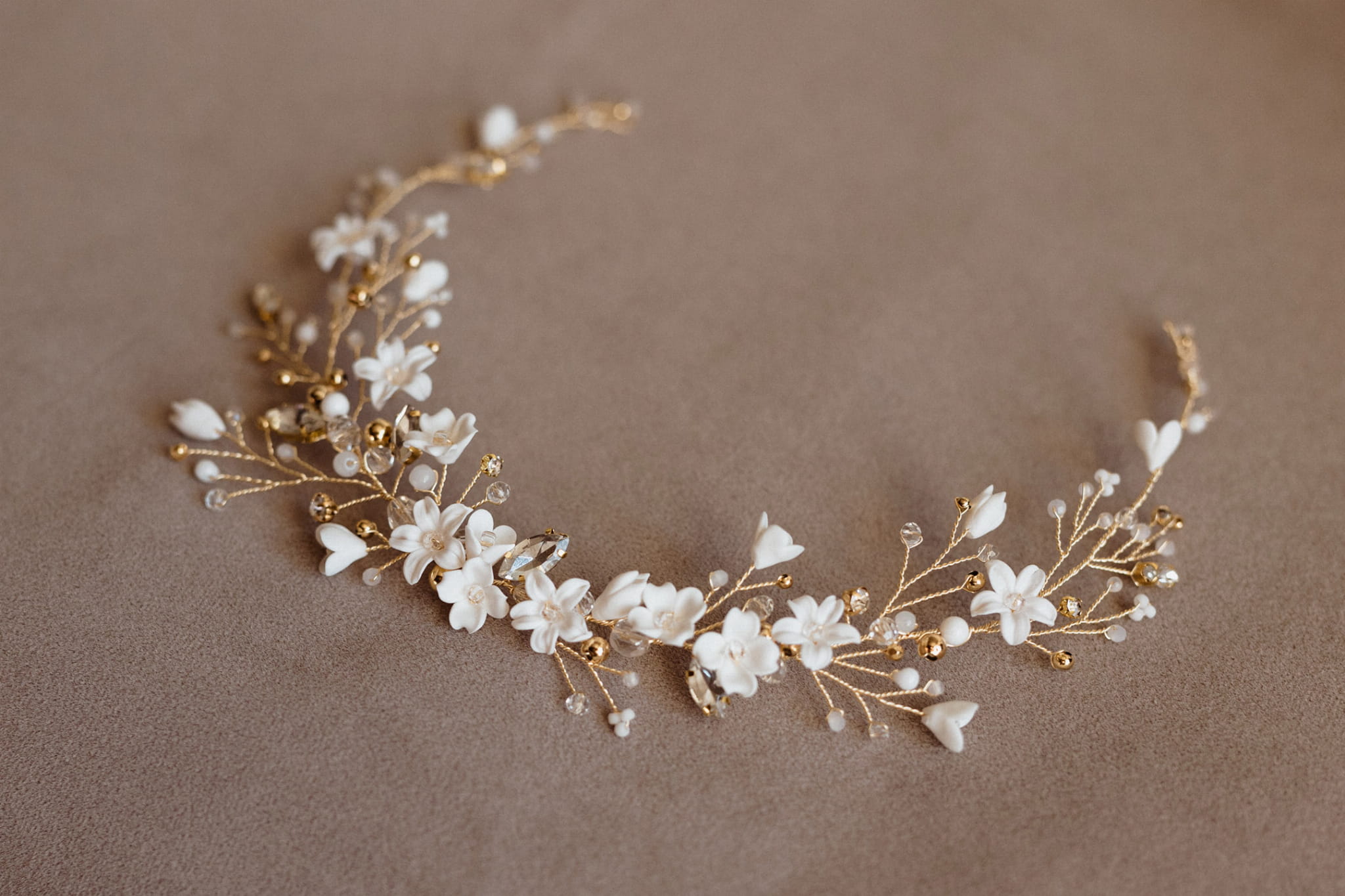Ozdobna gałązka ślubna, delikatna, a jednocześnie pełna detali przyciągających oko. Bogactwo kryształków, kuleczek oraz uroczych kwiatków tworzy zgrabną kompozycję, idealnie wpisującą się w obecne trendy ślubne.