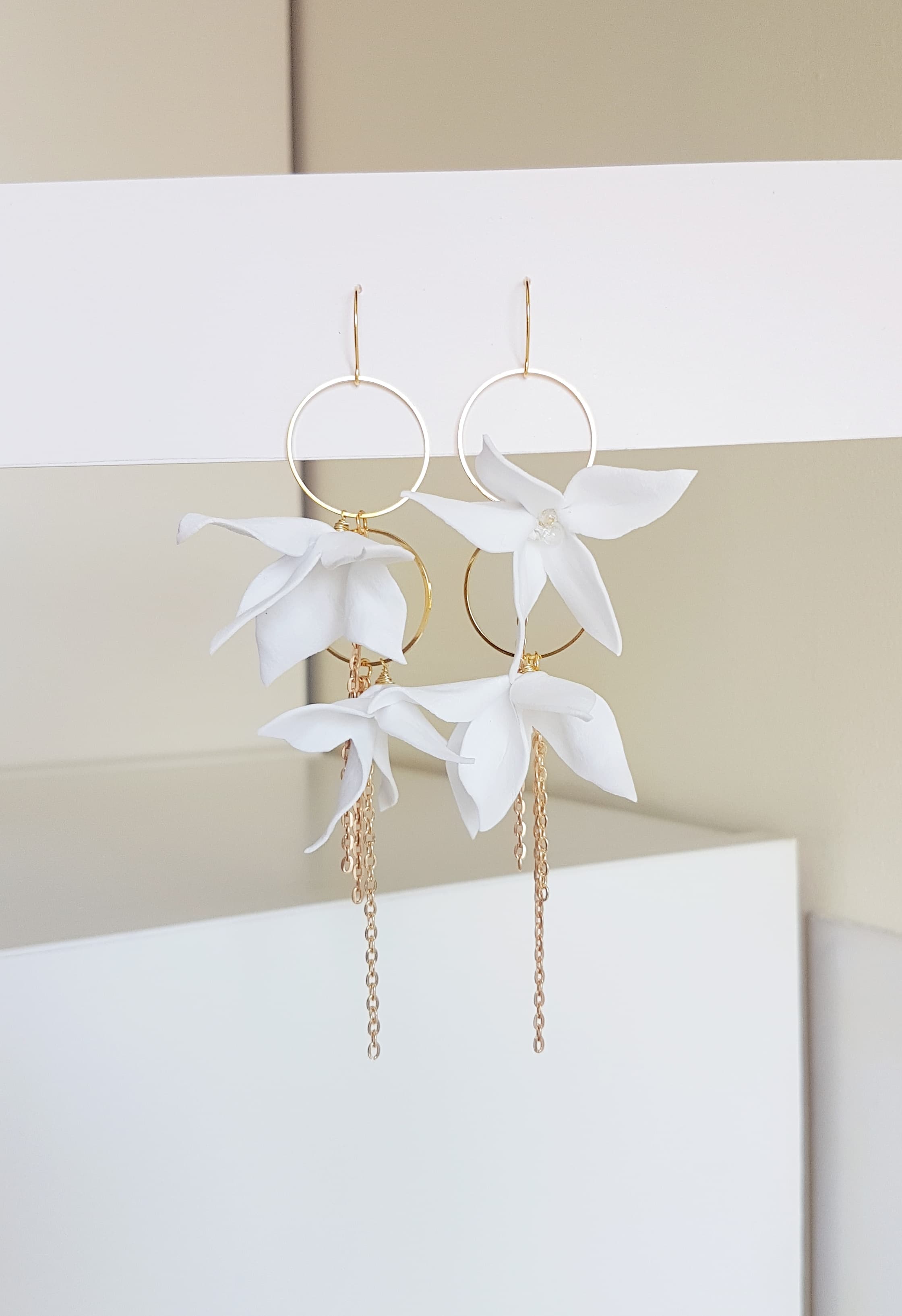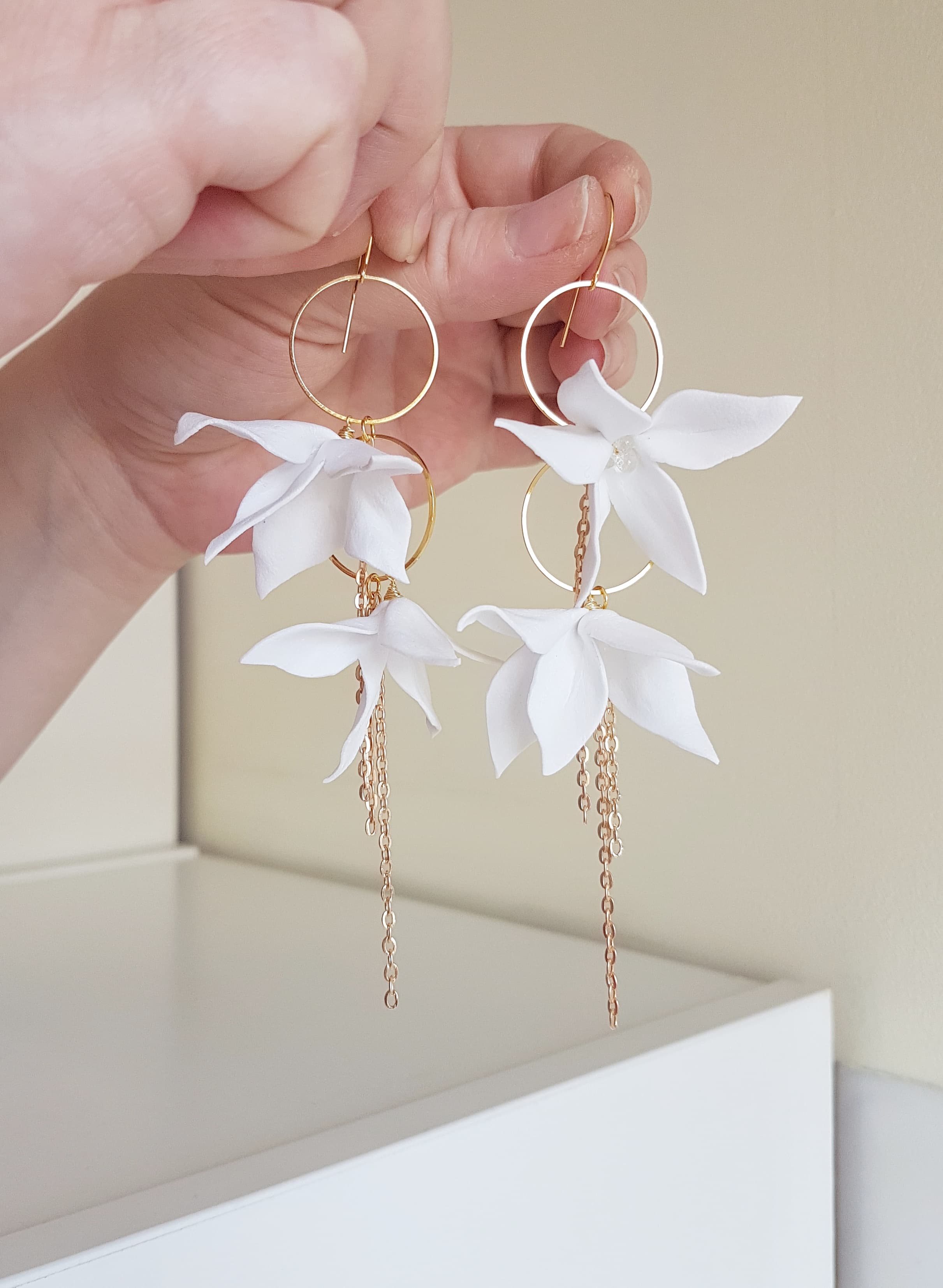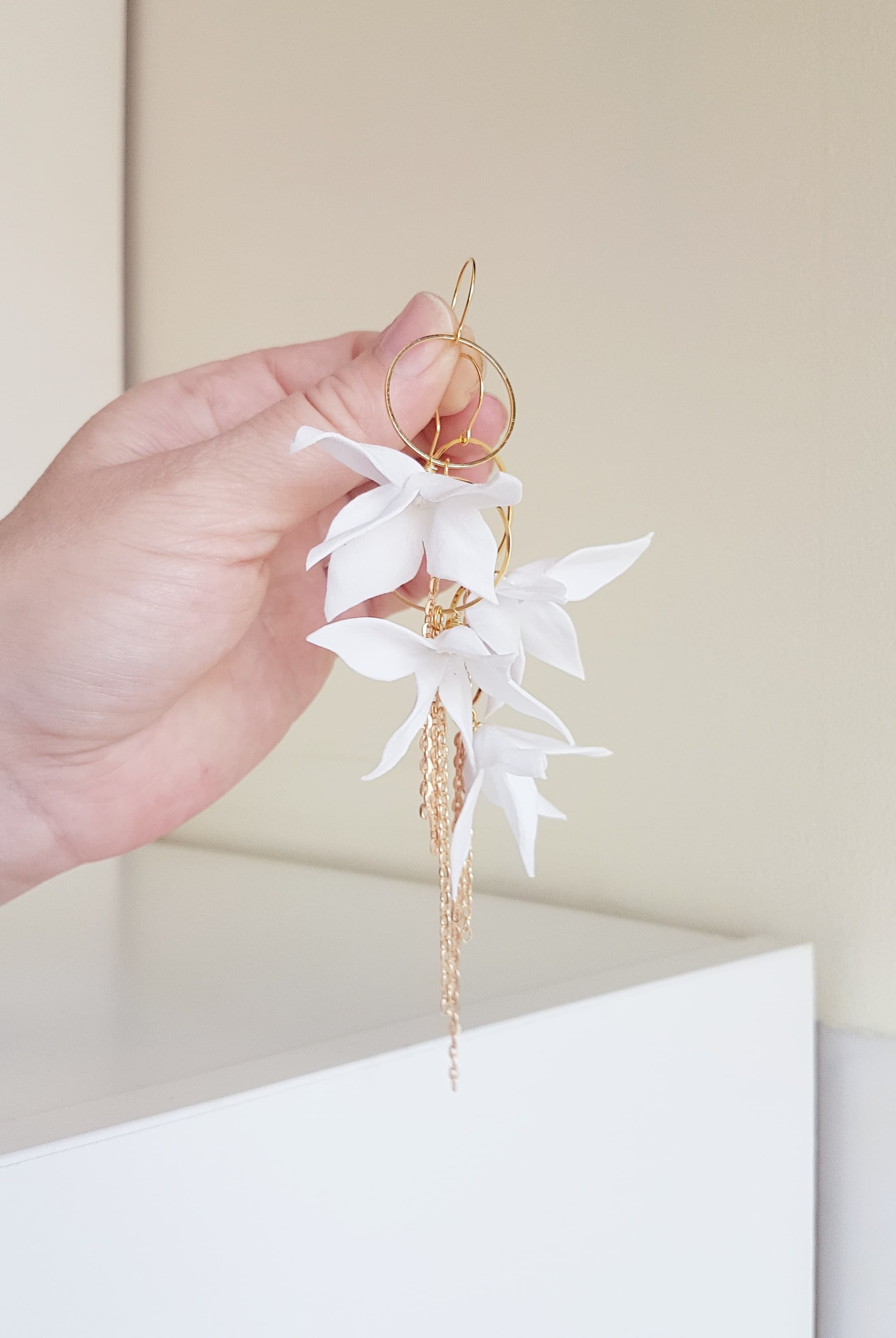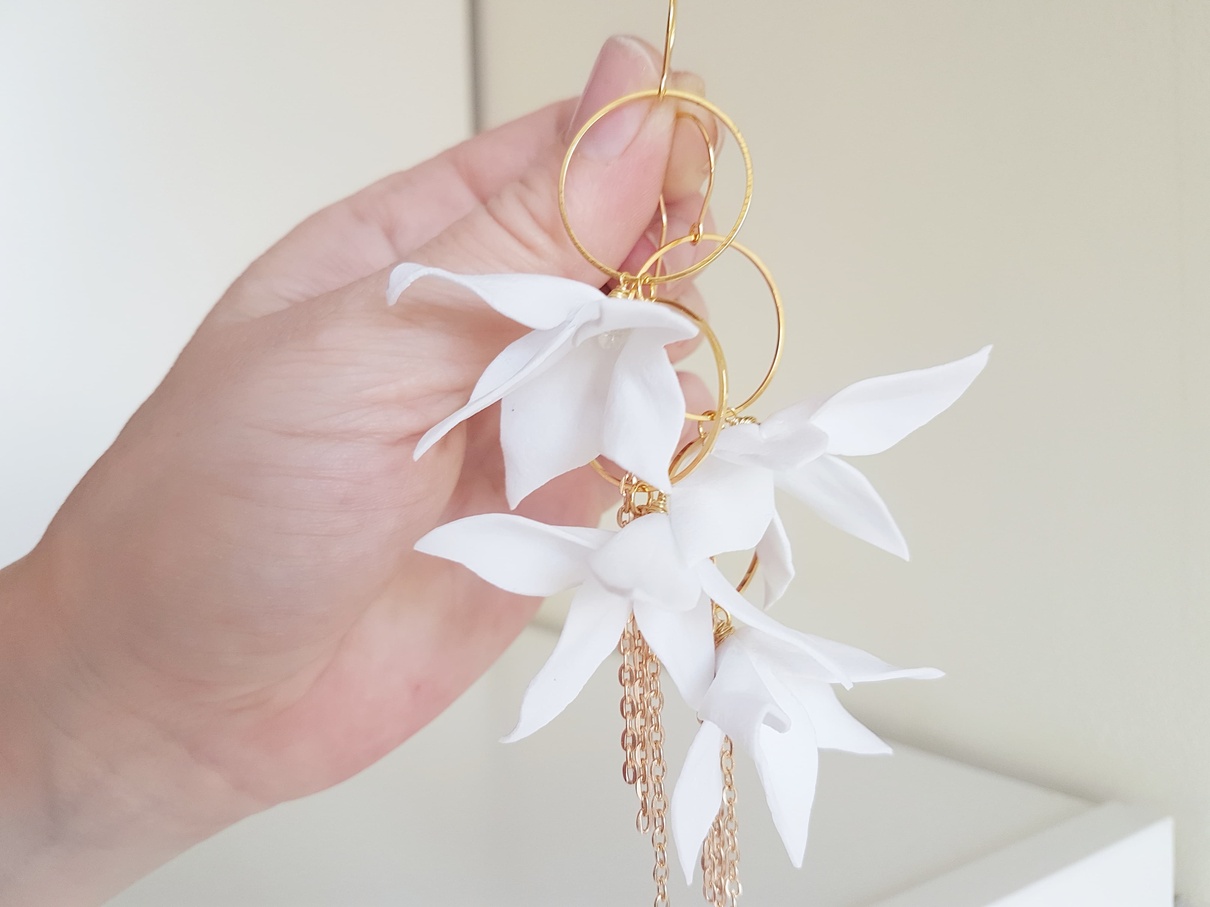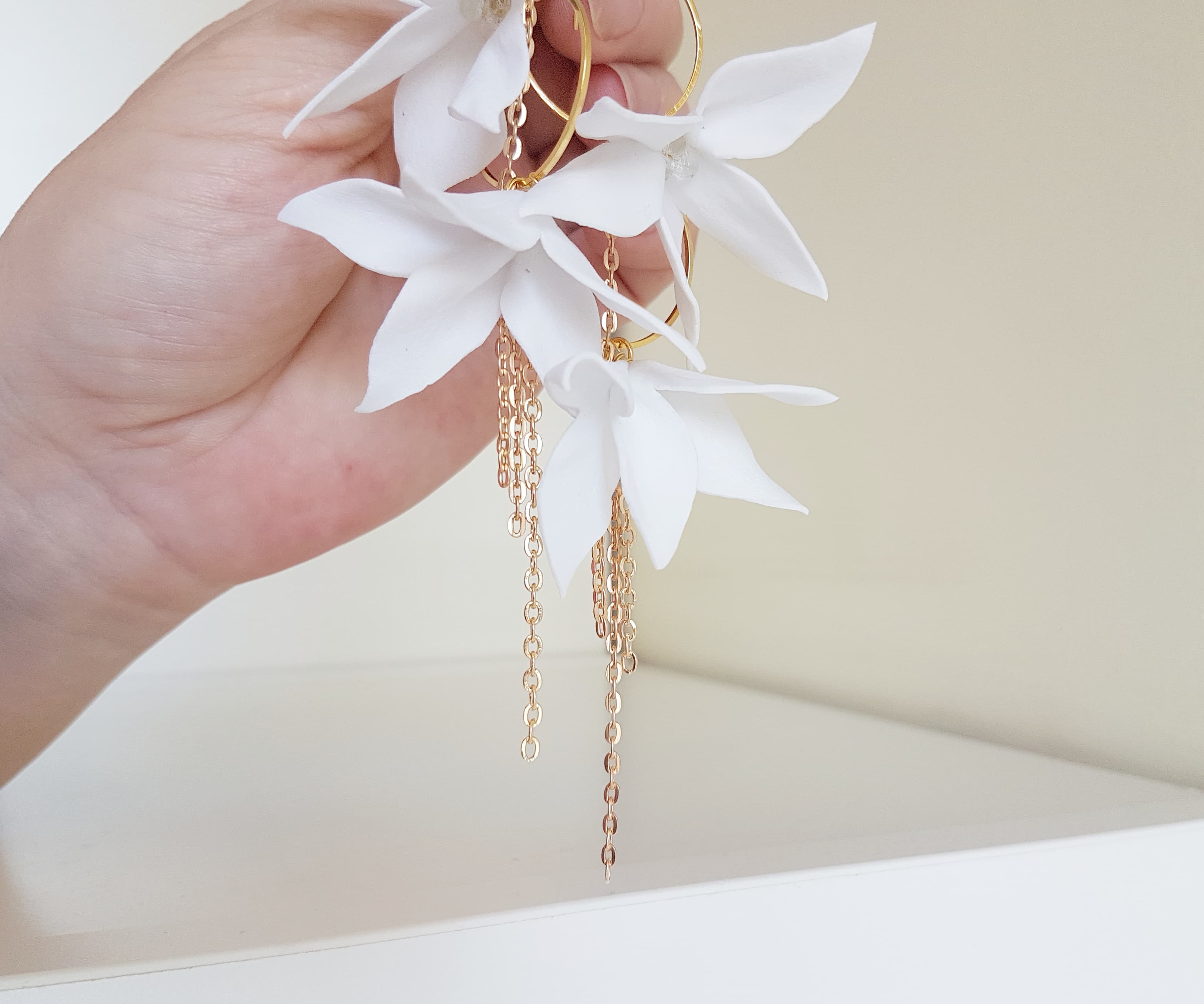 Kobiece i zmysłowe, inspirowane naturą przepiękne kolczyki ślubne. Idealnie podkreślą styl minimalistycznych sukien, dodając im subtelnej delikatności i zwiewności. Kwiaty, stworzone z białej termoplastycznej pianki, ręcznie modelowanej, które nie ulegają odkształcaniu i są wodoodporne. Pozostałe półfabrykaty są w odcieniu złota.
