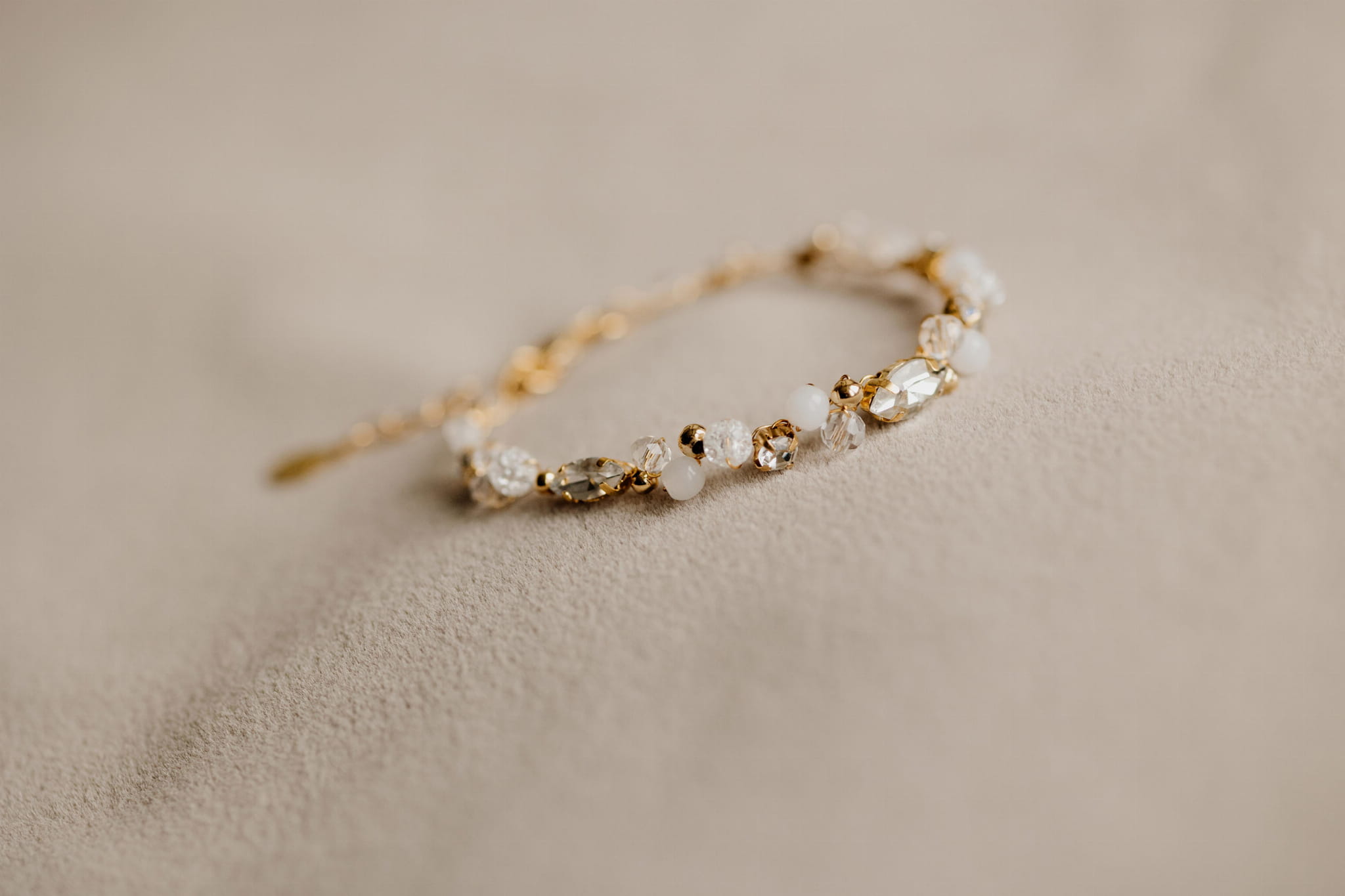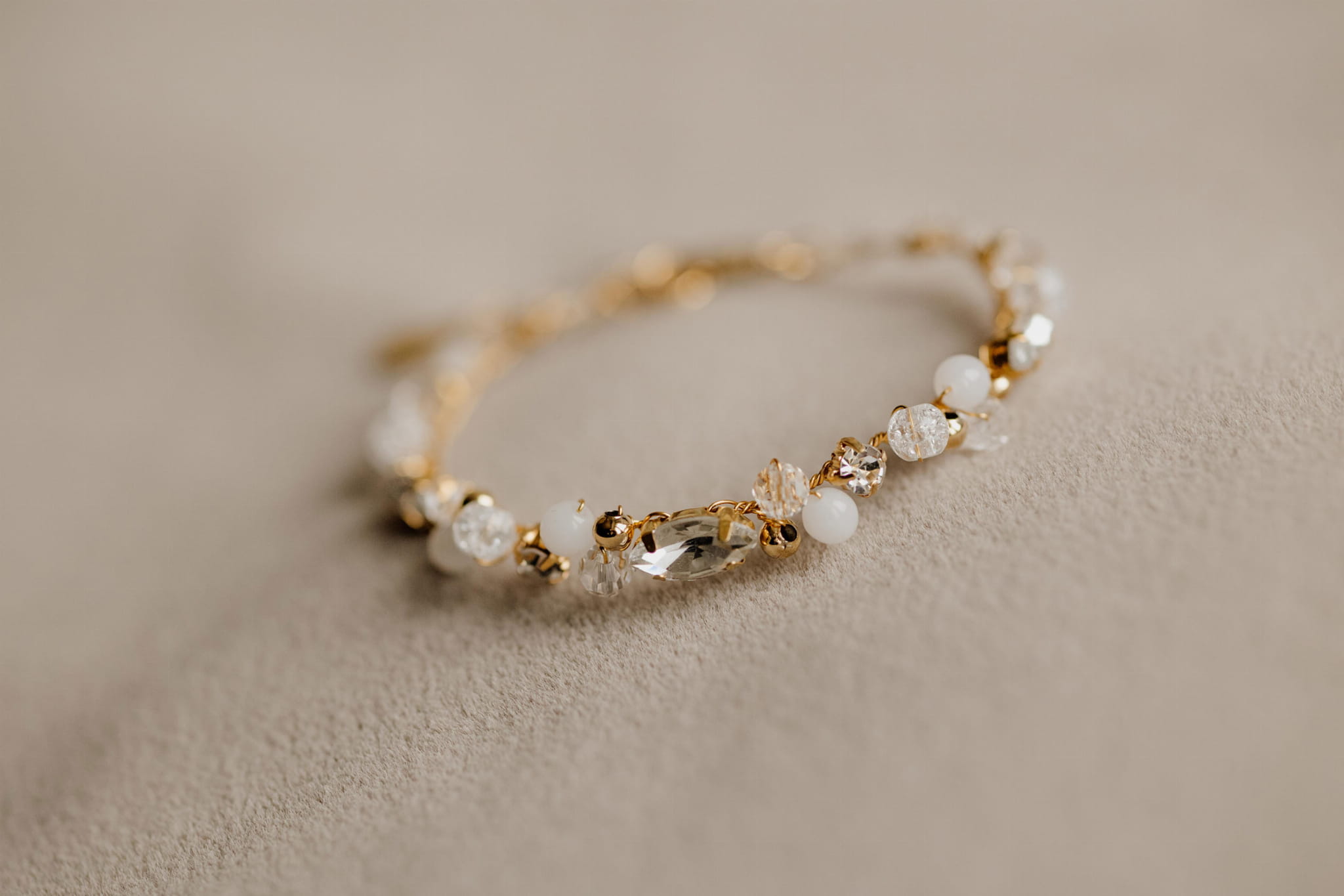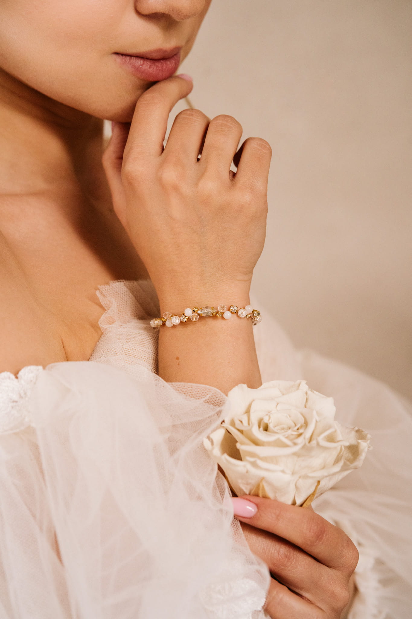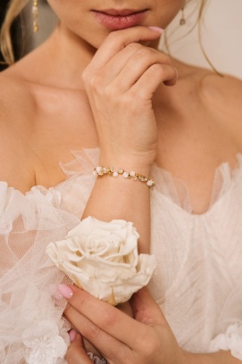Ozdobna bransoletka ślubna pełna magii i blasku kryształków, tworzy idealny dodatek do eleganckich, jak i romantycznych stylizacji. W subtelny i urokliwy sposób nada im szyku oraz oryginalności.