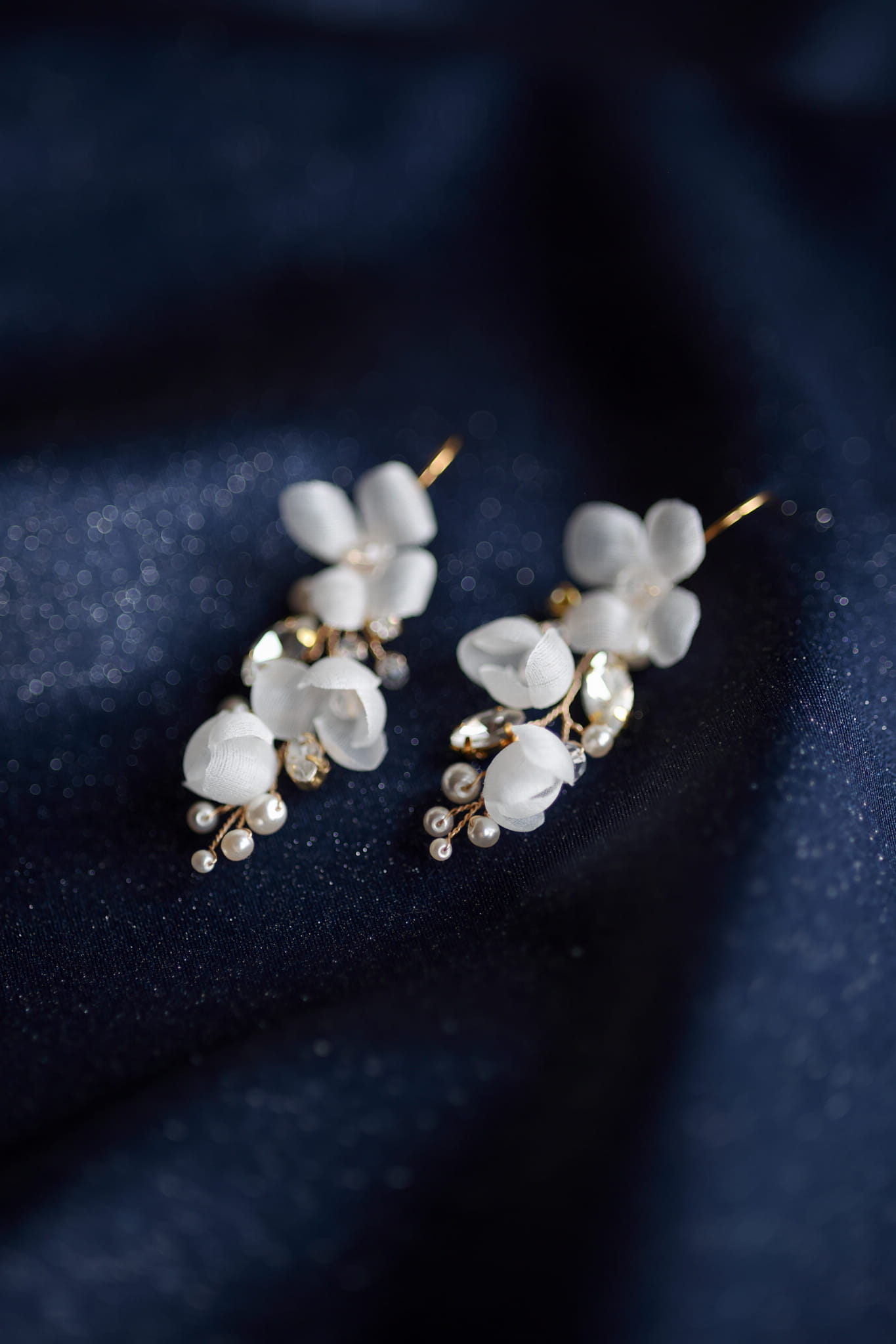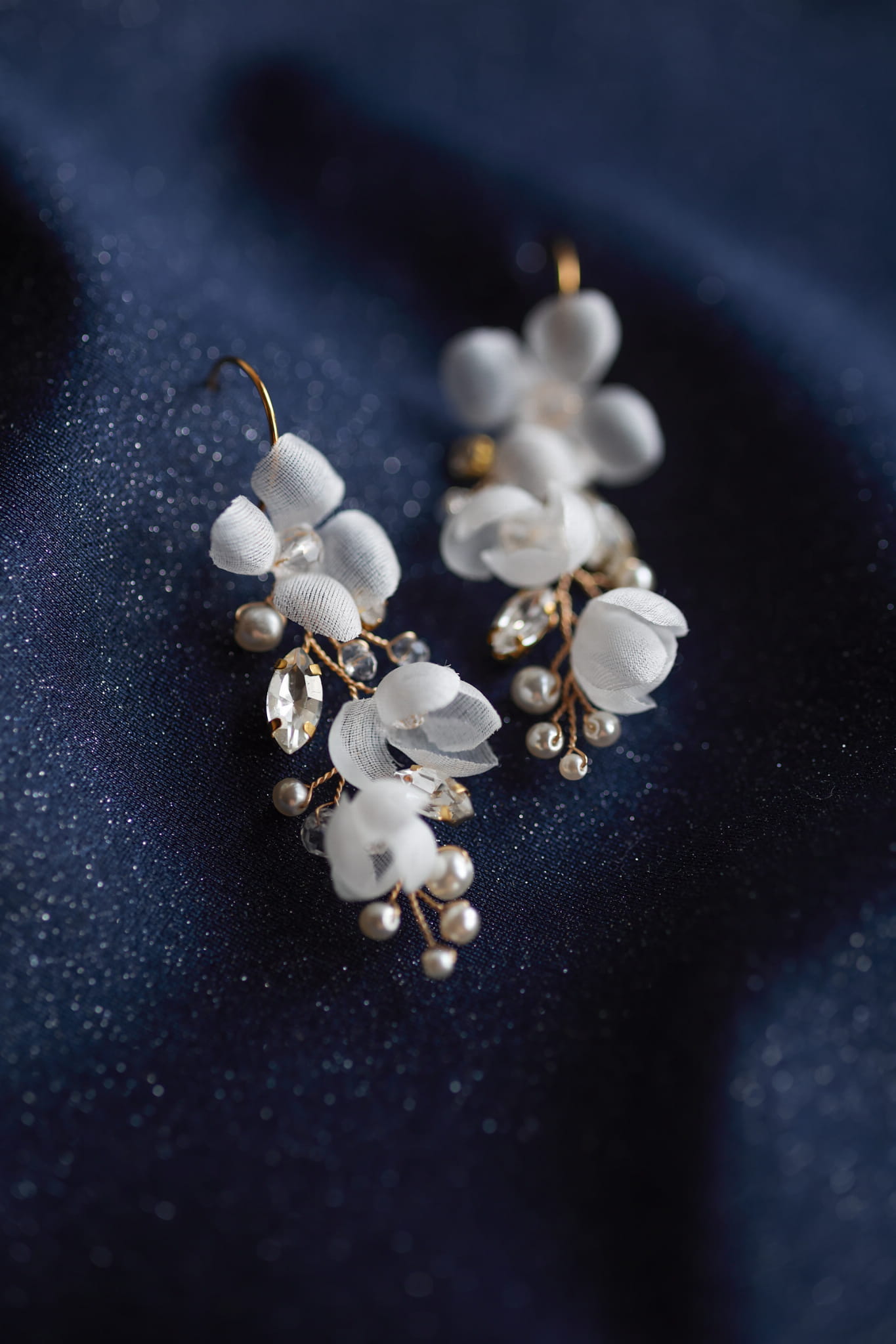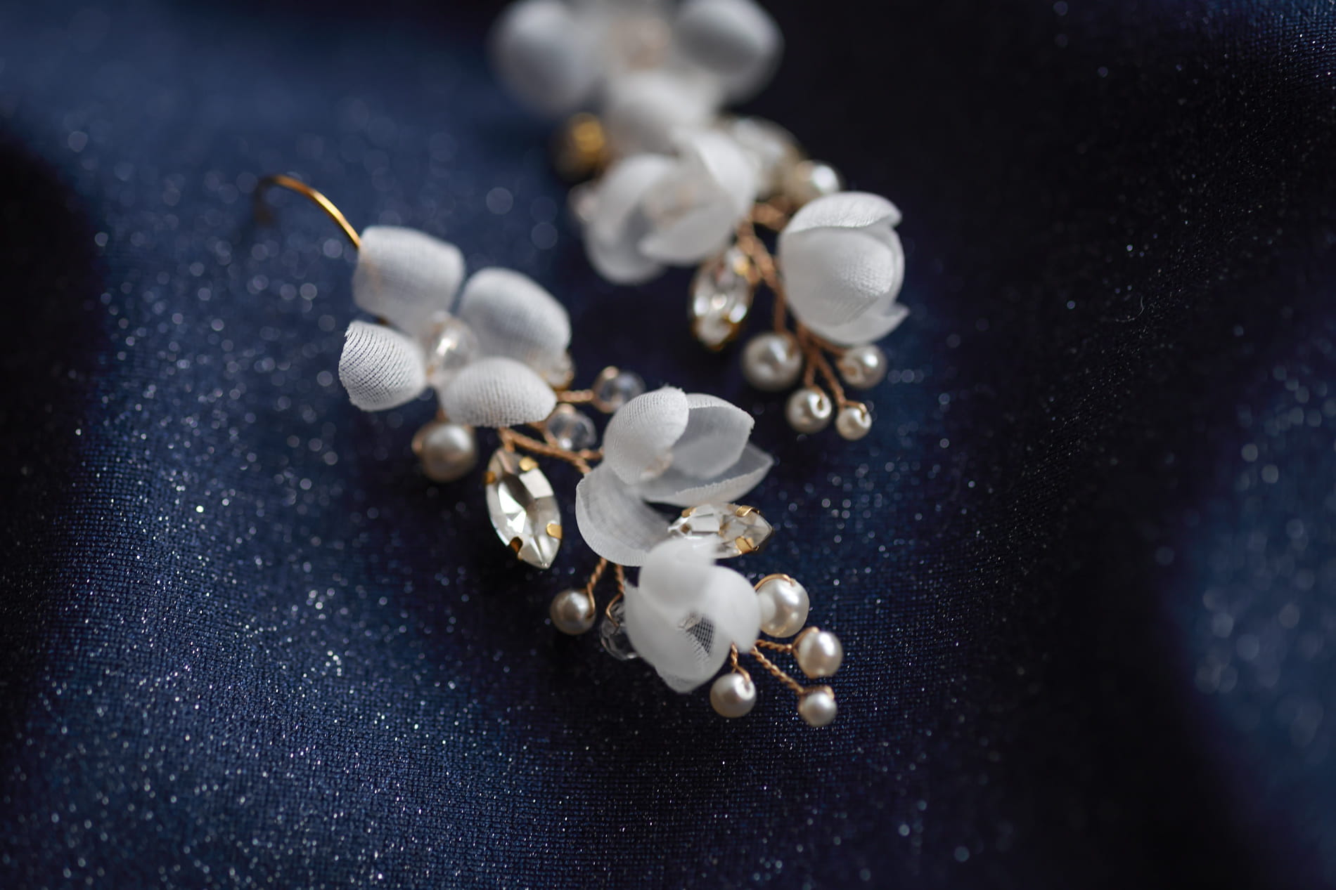 Kolczyki ślubne, z jedwabnymi kwiatami lśniącymi kryształkami i perełkami, uwodzą swą eterycznością i niepowtarzalnym wdziękiem. Przepięknie i w niewymuszony sposób podkreślą piękno Panny Młodej, komponując się z różnymi stylami ślubnymi - romantycznymi i zmysłowymi, klasycznymi, czy rustykalnymi.