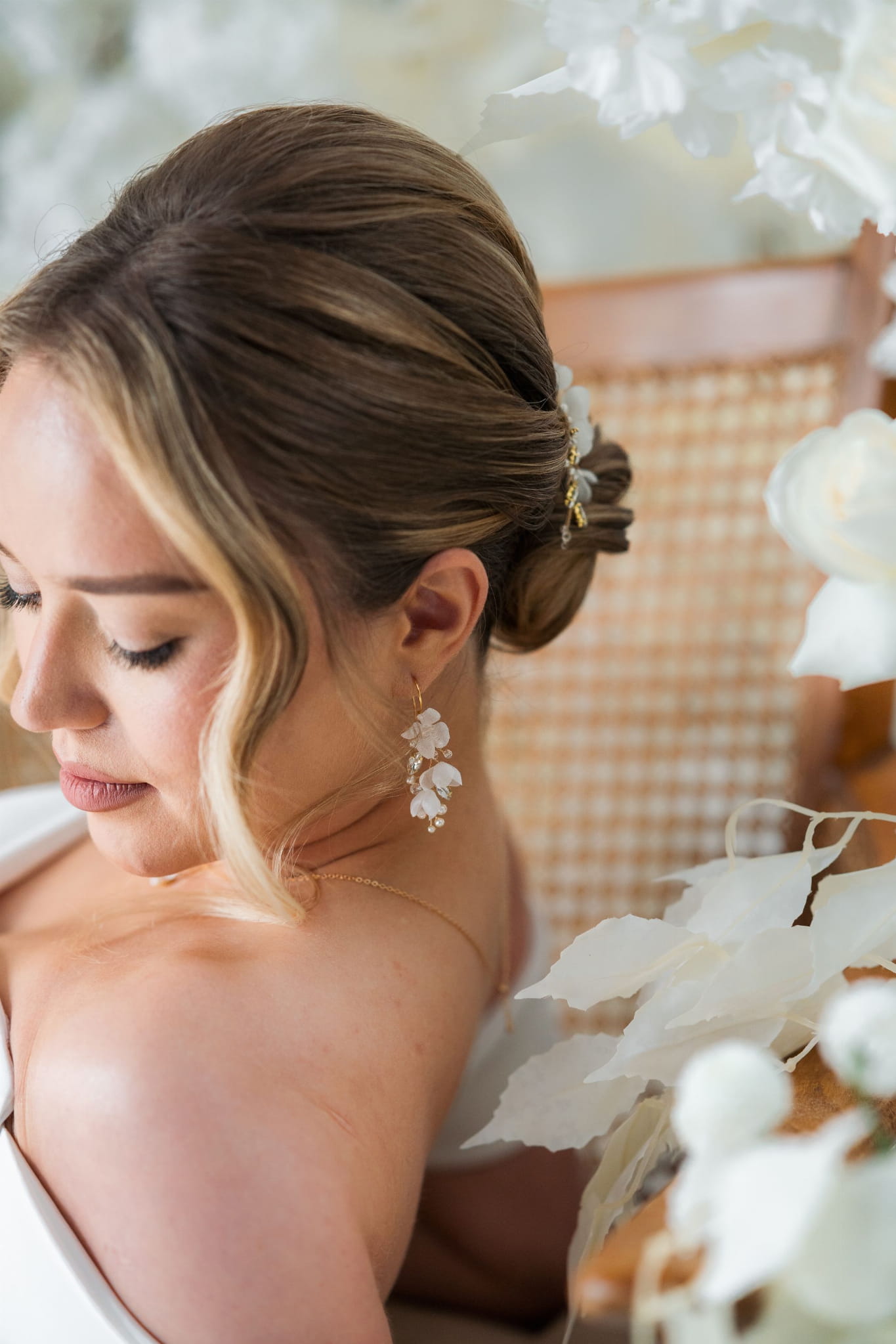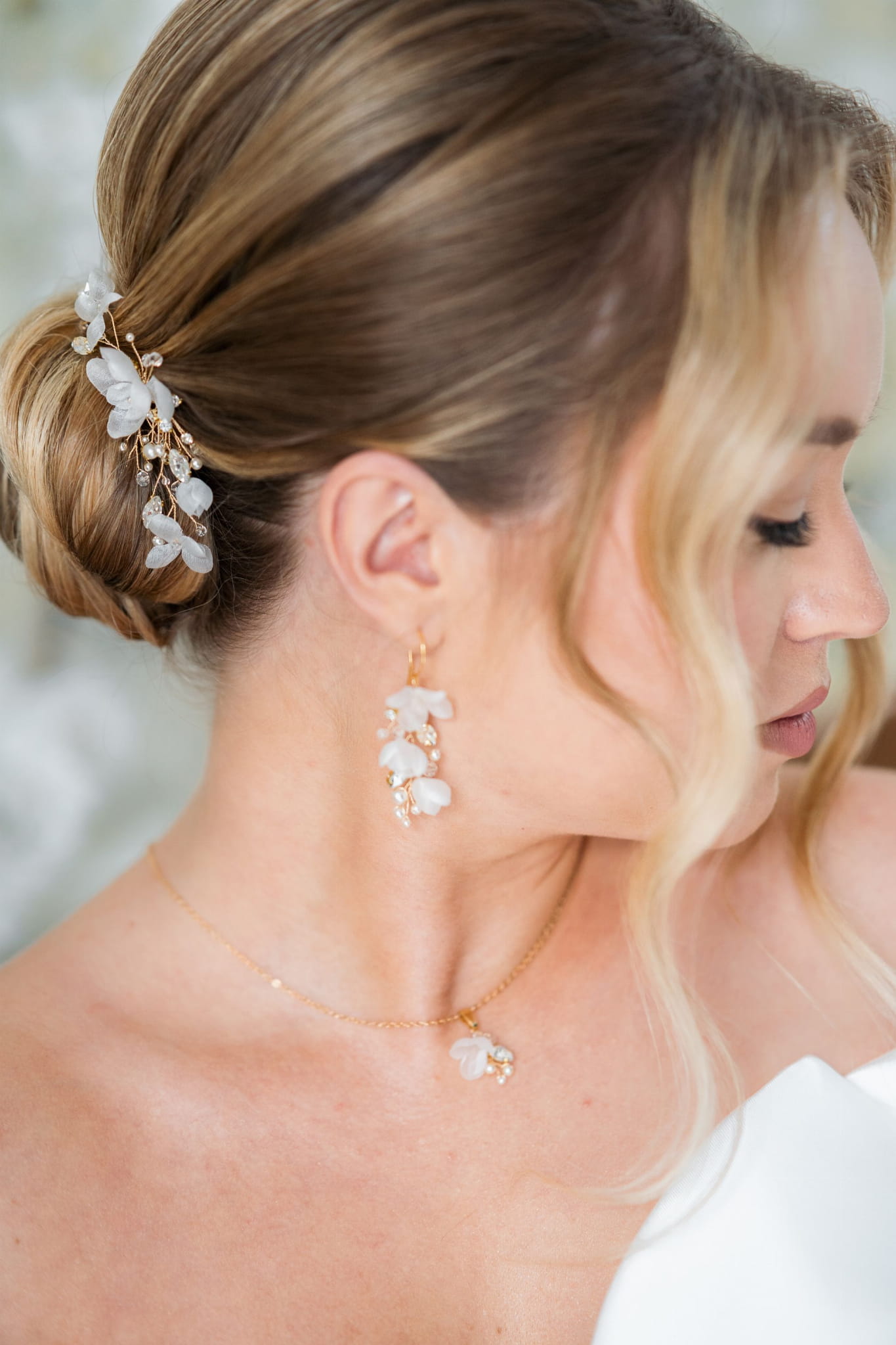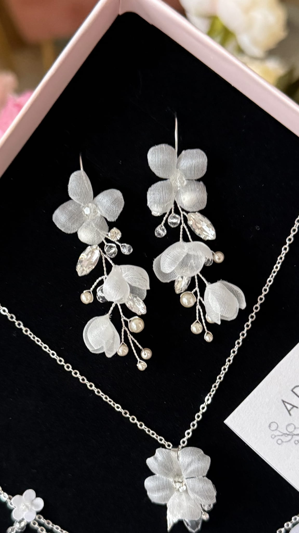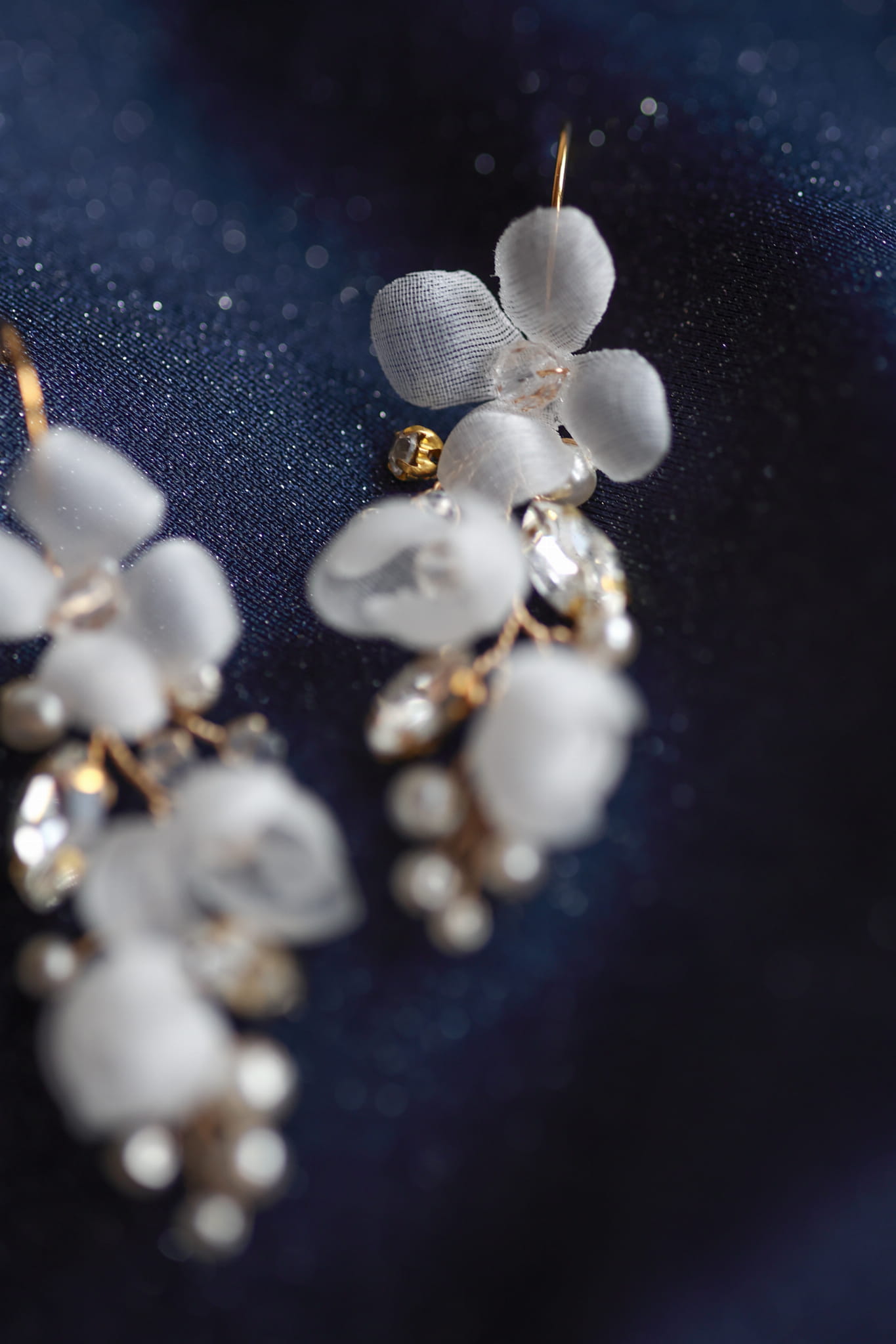 Kolczyki ślubne, z jedwabnymi kwiatami lśniącymi kryształkami i perełkami, uwodzą swą eterycznością i niepowtarzalnym wdziękiem. Przepięknie i w niewymuszony sposób podkreślą piękno Panny Młodej, komponując się z różnymi stylami ślubnymi - romantycznymi i zmysłowymi, klasycznymi, czy rustykalnymi.