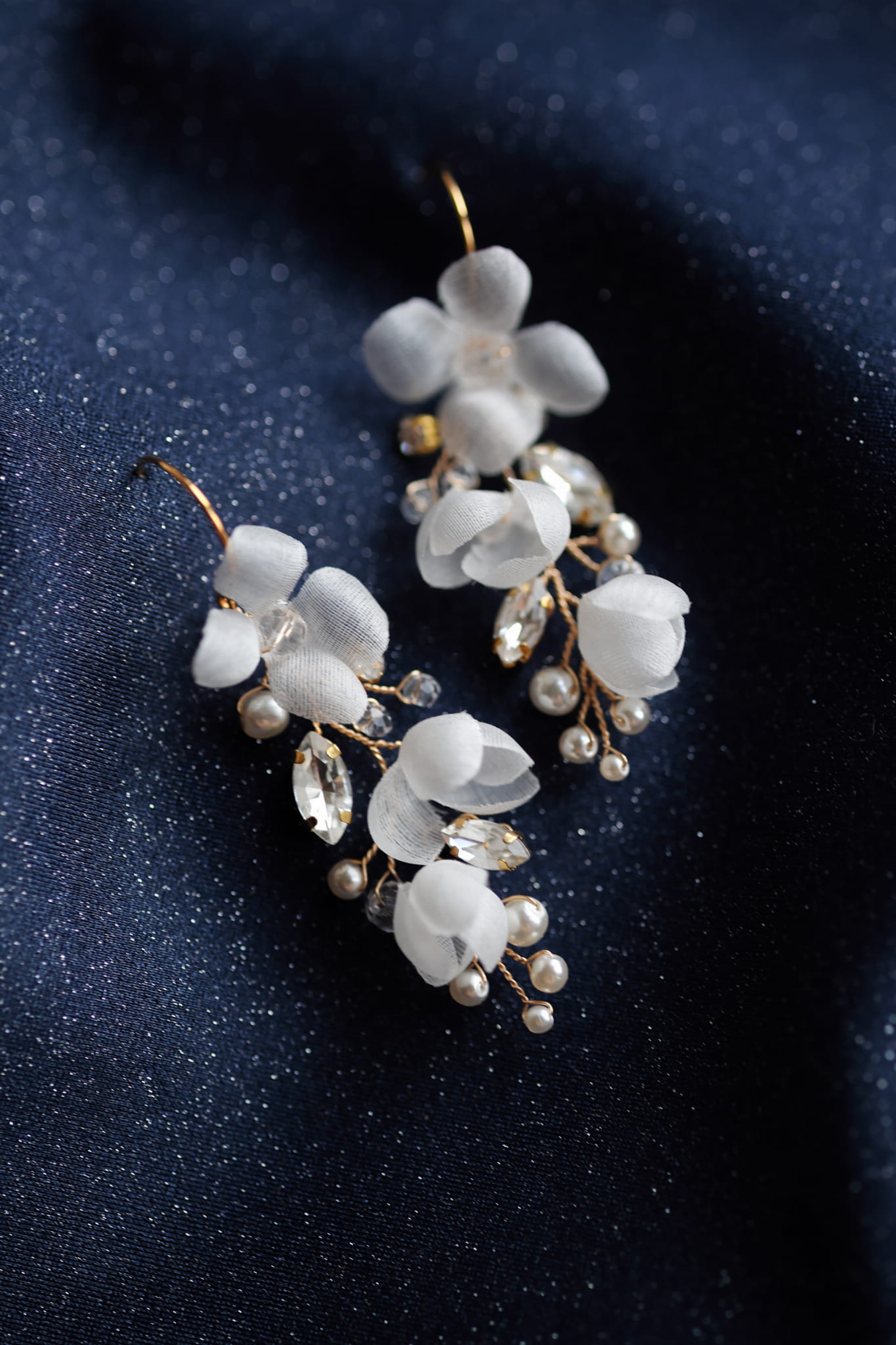 "Grace" - kolczyki z jedwabnymi kwiatami, kryształkami i perełkami